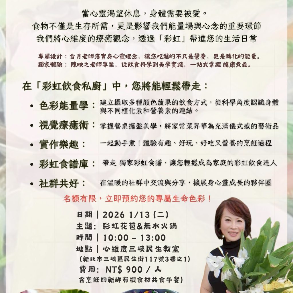 讓身心靈每天都在高頻運轉 幸福能量系列 週二下午讀書會 你的人生使用說明書 看懂你的人生設定 了解更多 週四上午讀書會 靈魂永生 探索靈魂多次元視野 了解更多 週四下午讀書會 能量激活 找回生活的平衡與意義 了解更多 週日讀書會 輪迴兩千年的命定相遇之旅 找回靈魂的家人 了解更多 週三下午讀書會 找回內在陽光小孩 81個連結與釋放練習 了解更多 週五晚上讀書會 生活Alpha 線上冥想練習 了解更多 優雅創造系列 作伙食健康 用七彩能量,喚醒您的內在陽光小孩 了解更多 植物自畫像 感受靜謐的能量 了解更多 靜心禪繞DIY 專注和放鬆冥想的理想狀態 了解更多 綠療癒DIY 植物靜謐的能量 了解更多 生命力能量系列 八字中的生命啟示 感恩冥想。脈輪調理。能量療癒。 了解更多 水晶頌缽。靜心療癒の夜 感恩冥想。脈輪調理。能量療癒。 了解更多